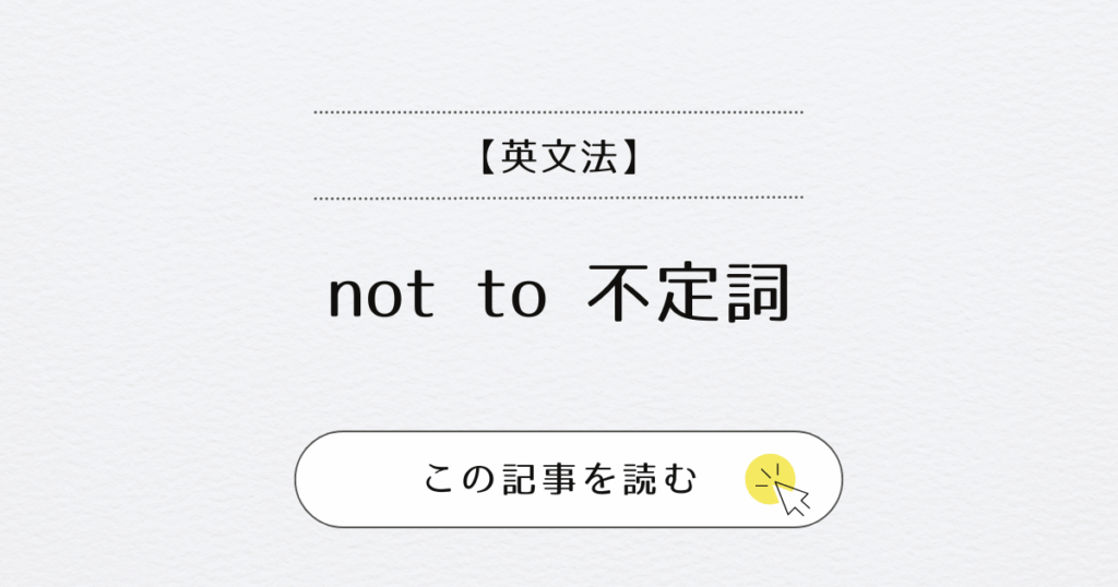 不定詞に否定語を付ける場合の語順は not to 動詞の原形 不定詞に not や never などの否定の意味を表す副詞を付ける場合は、to の直前に置きます。 not to + 動詞の原形の形になります。 以下の2つの文を比べてみましょう。 I tried to sleep. 「私は寝... -