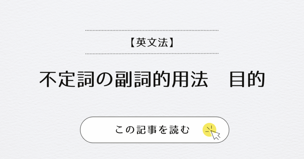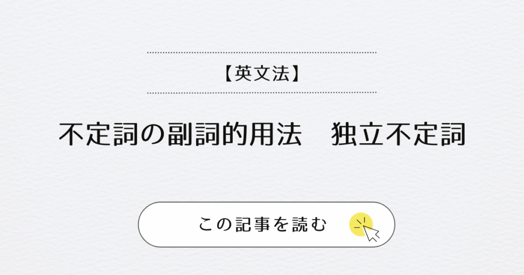 不定詞の副詞的用法 不定詞は準動詞の仲間で、大きく分けて名詞的用法、形容詞的用法、副詞的用法の3種類の用法があります。 ちなみになぜ不定詞という名前なのかと言うと、不定詞は文中に入らないと名詞、形容詞、副詞の内どの使い方になるか確定しな... -