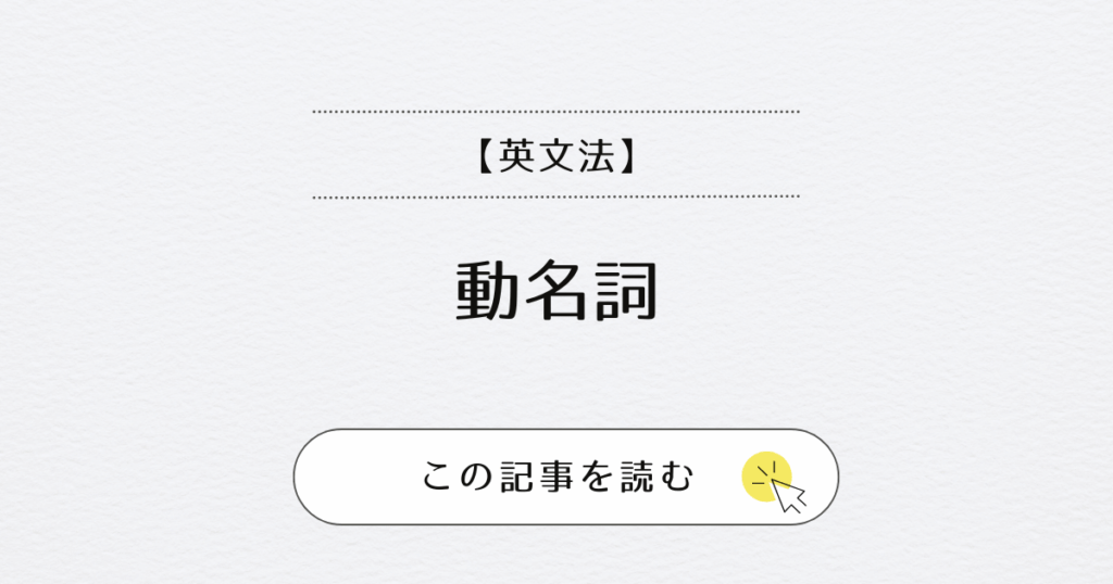 動名詞=名詞 動名詞は準動詞の仲間で、動詞を名詞として使う使い方です。 「動名詞」という文法用語は、数ある日本語の文法用語の中でもかなり意味が分かりやすいです。まさに読んで字のごとく。動詞を名詞として使うので、動名詞です。 *動詞の原形+~i... -