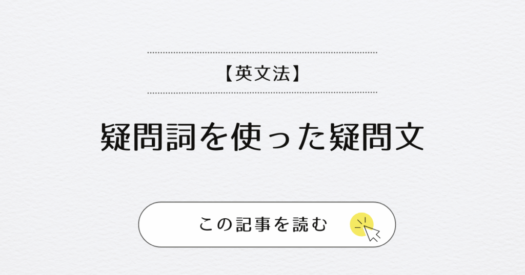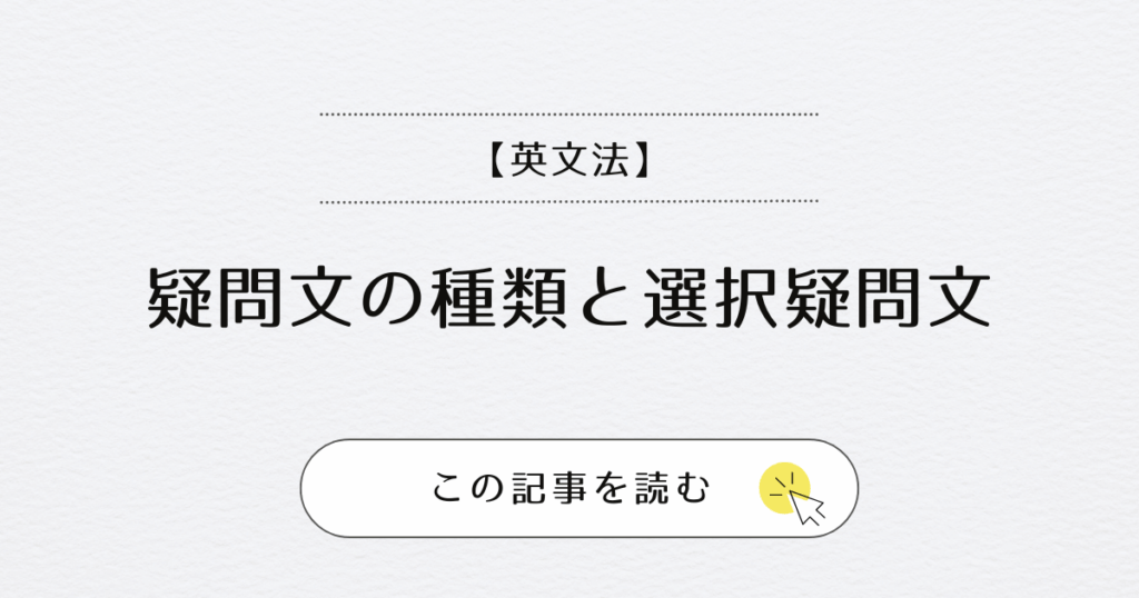 疑問文の種類 疑問文には大きく分けて、Yes / No Question、疑問詞を使った疑問文、選択疑問文の3つの種類があります。 どの種類の疑問文を使うかで、相手にどのように答えて欲しいかが決まります。 それでは、一つずつ確認していきましょう! ① Yes / No... -