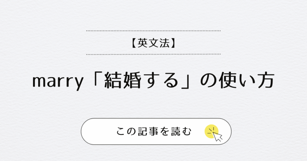 意外とややこしいmarry marry は「~と結婚する」という意味の他動詞で、日本語の意味に「~と」が付いていますが、前置詞の with を付けて使いません。 (他)marry「~と結婚する」marry with marry には以下の3つの使い方があります。 他動詞の marry ... -